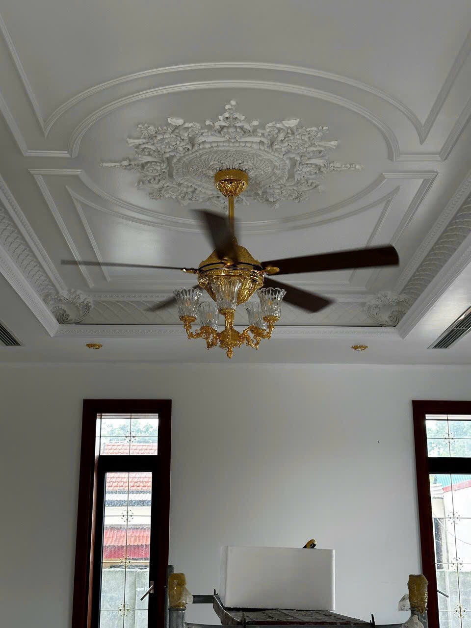 Hình ảnh lắp đặt thực tế quạt trần đèn 5 cánh Fengye FY968 mạ vàng 9999