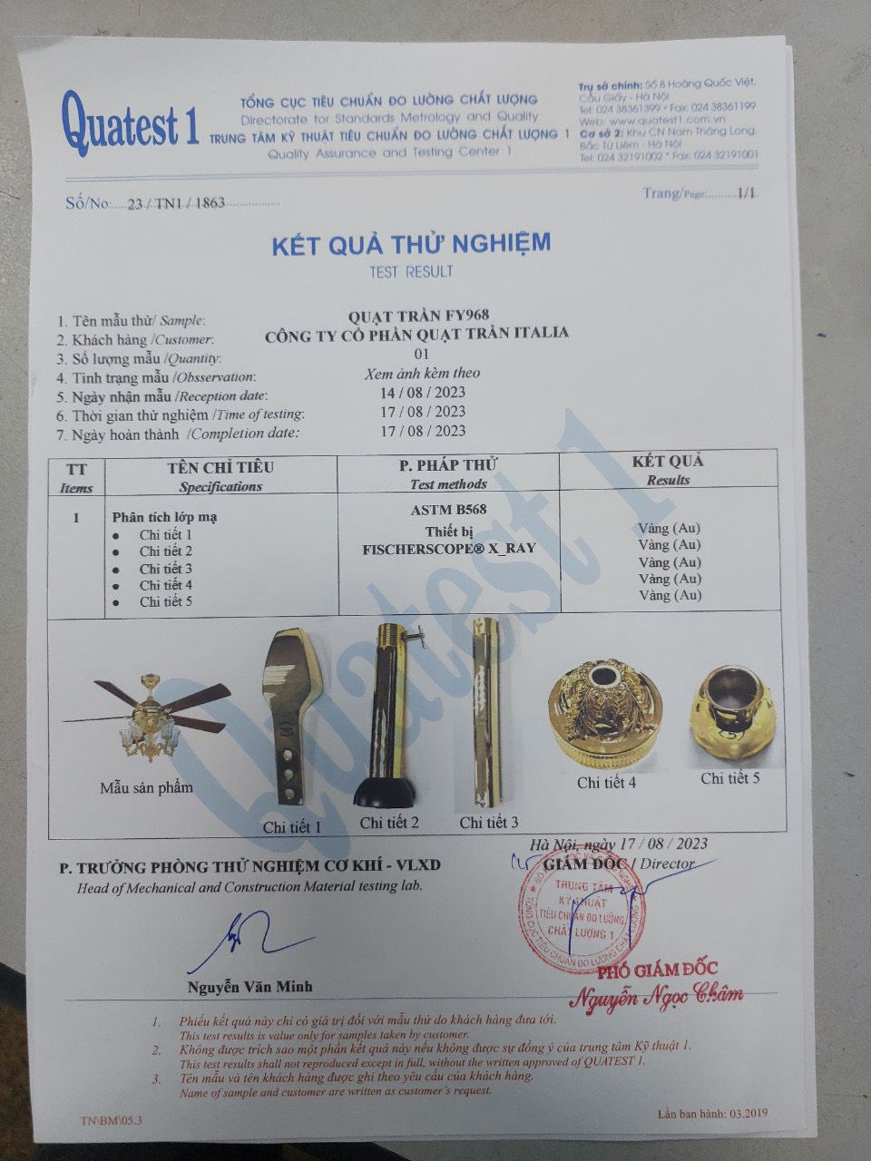 Chi tiết mạ vàng của quạt trần đèn 5 cánh Fengye FY968 được test bởi trung tâm Quatest 1