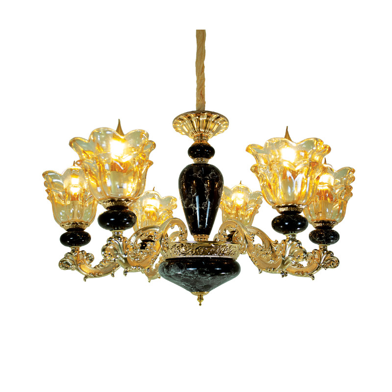 - Thiết kế: Đèn mang phong cách hoàng gia Châu Âu trường tồn với thời gian. Thiết kế với điểm nhấn là 6 chao đèn hình bông hoa đang nở rộ rất đẹp, chụp đèn vân đá màu xanh ngọc độc đáo rất phù hợp để trang trí tạo điểm nhấn, chiếu sáng cho không gian phong cách cổ điển, tân cổ điển