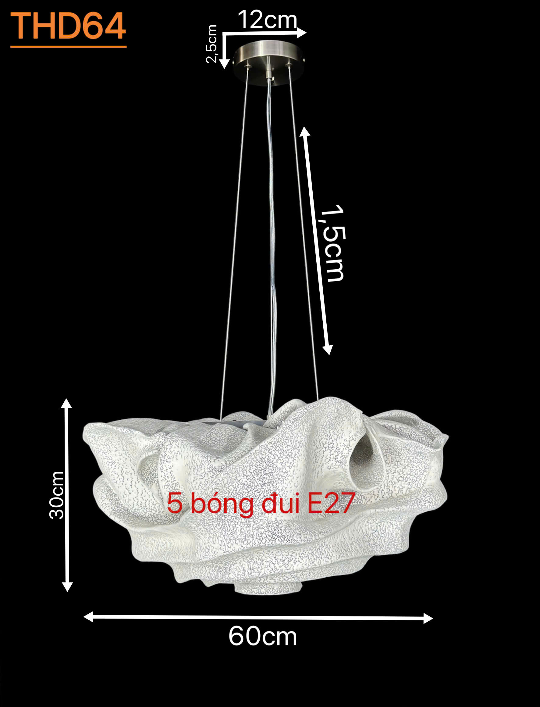 - Ánh sáng: Điểm vượt trội của THD64 là trang bị tới 5 bóng đui E27 bên trong chao đèn. Thiết kế này không chỉ giúp ánh sáng lan tỏa đều khắp "đám mây" mà còn đảm bảo cung cấp nguồn sáng mạnh mẽ, ấm áp cho toàn bộ căn phòng.
