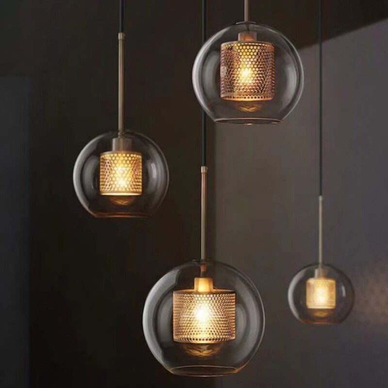 - Chất liệu: Chao đèn thủy tinh kết hợp với thân đèn hợp kim dạng lưới độc đáo