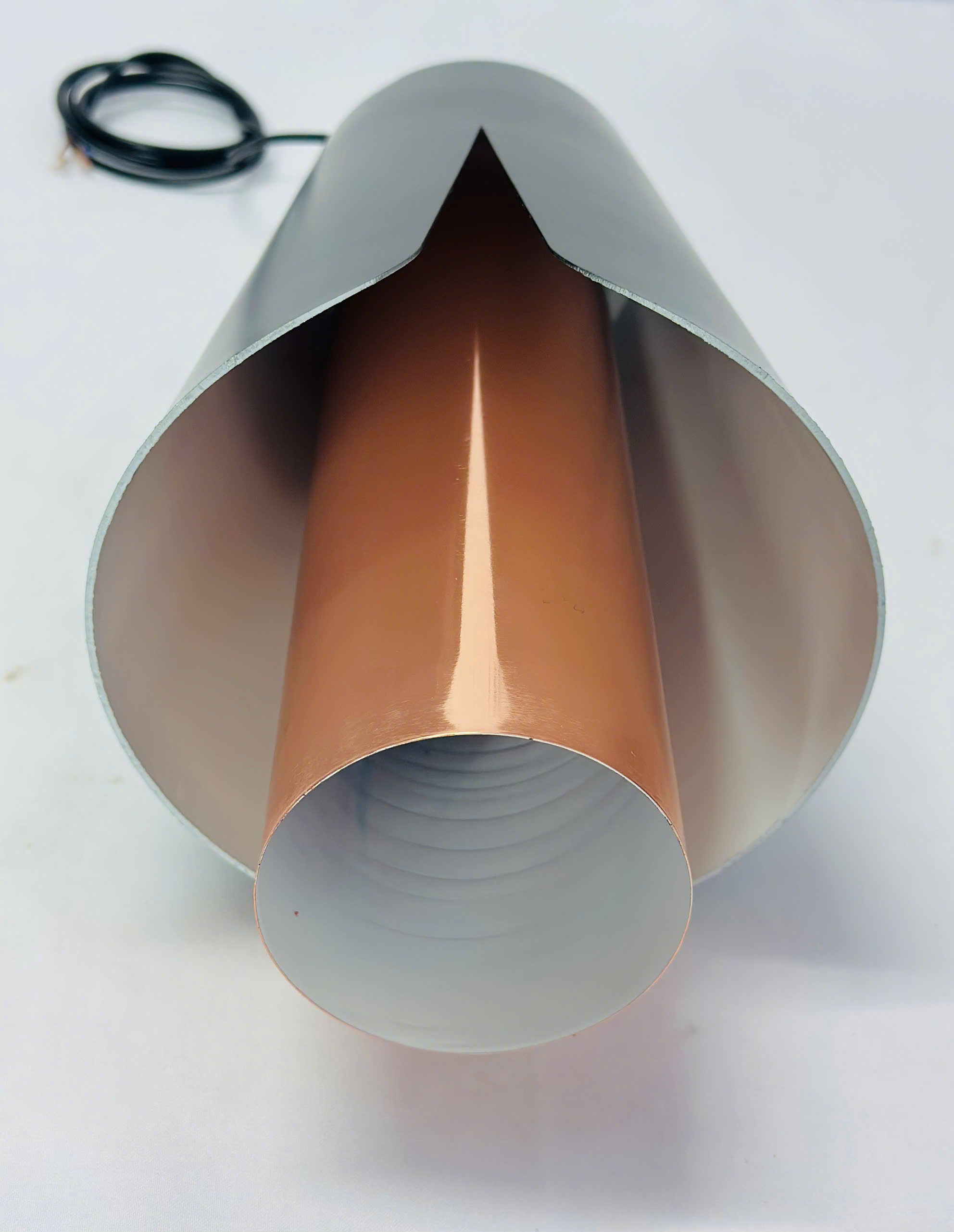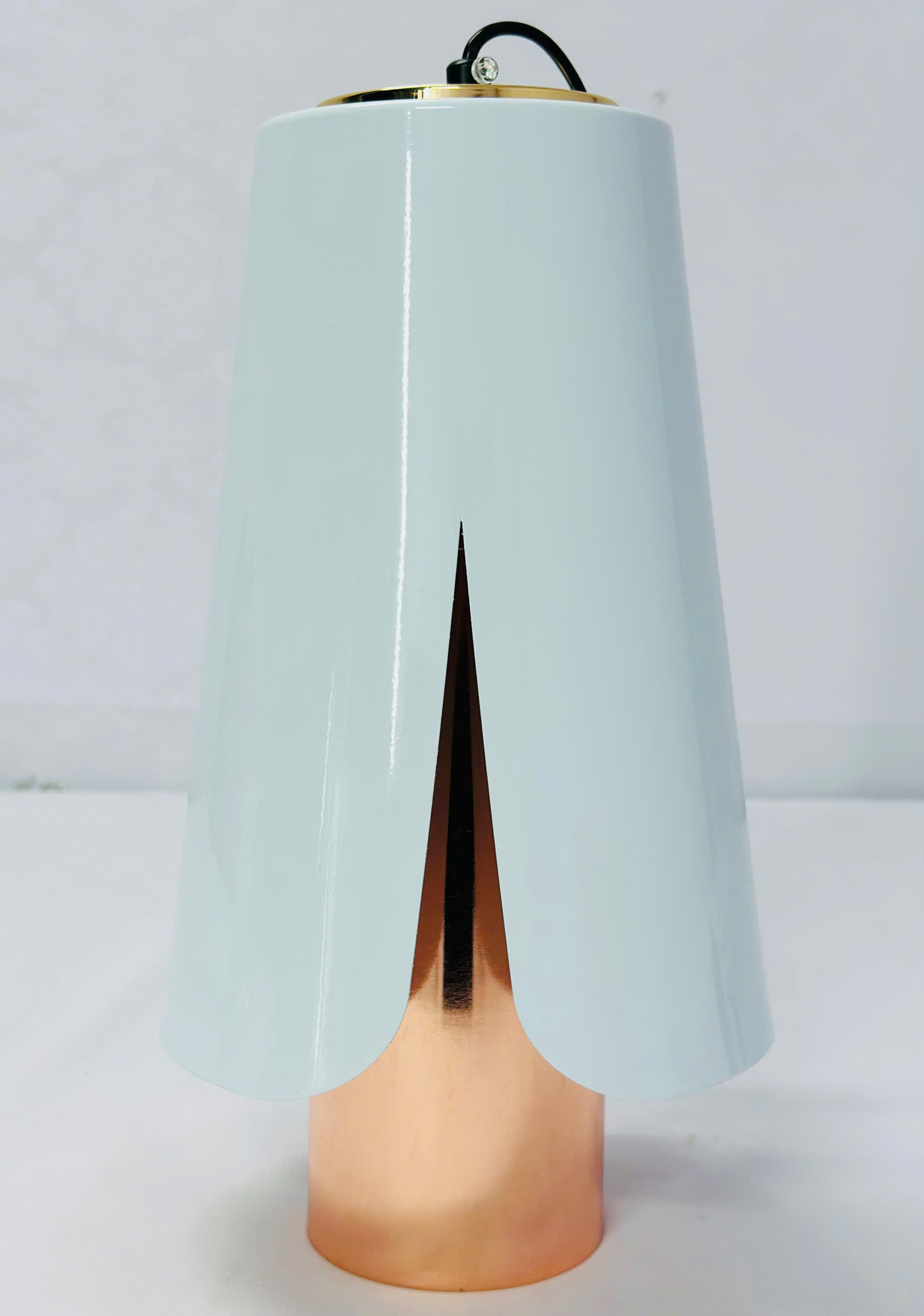 - Chi tiết điểm nhấn: Phần đuôi đèn lộ ra phía dưới được mạ màu đồng sáng bóng, tạo nên sự tương phản sang trọng với sắc đen huyền bí của thân đèn.