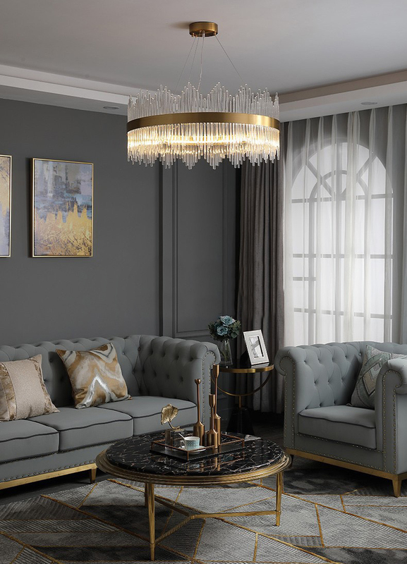 Đối với những ngôi nhà mang phong cách hiện đại hơn nhưng vẫn hướng tới tính sang trọng thì những chiếc đèn thả pha lê sẽ là lựa chọn không tồi cho không gian phòng khách thêm phần sang trọng, đẳng cấp.