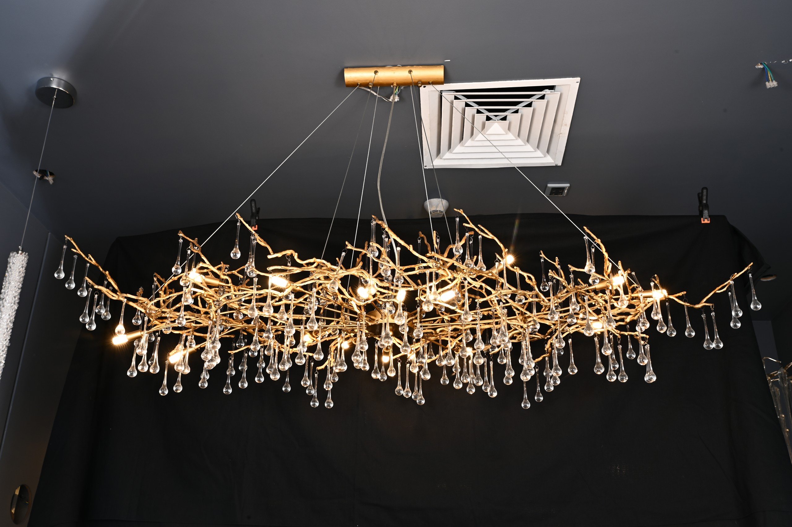 - Thiết kế: Đèn thả có thiết kế mang tính nghệ thuật, với hình dáng như các rễ cây, cành cây kết hợp với những giọt "sương mai" bằng pha lê trong suốt. sang trọng, tinh tế. Đèn thả pha lê dáng ngang phù hợp sử dụng cho phòng ăn có bàn ăn dáng dài, thả quầy bar, đảo bếp.... Đây sẽ là điểm nhấn tuyệt vời cho ngôi nhà của bạn.