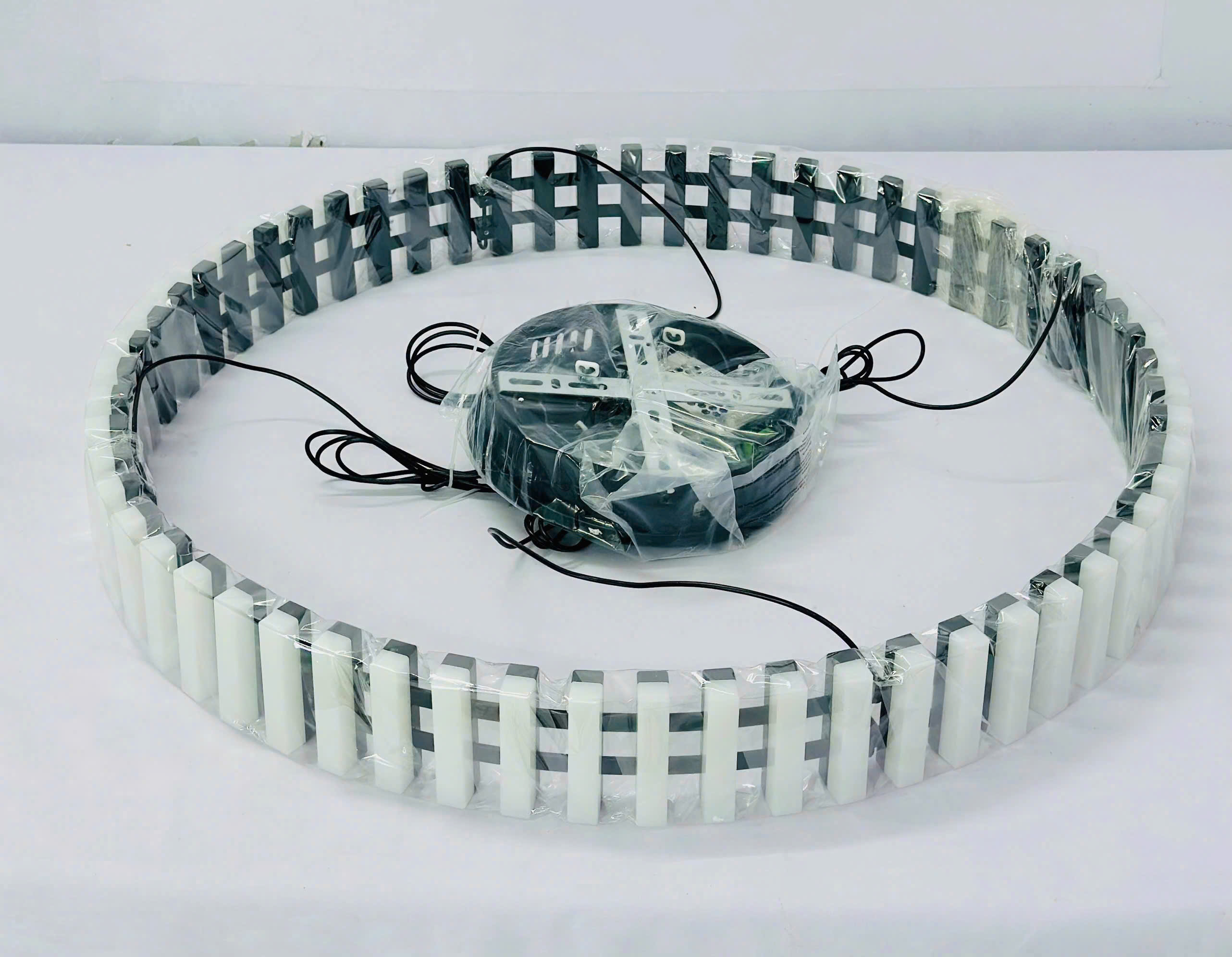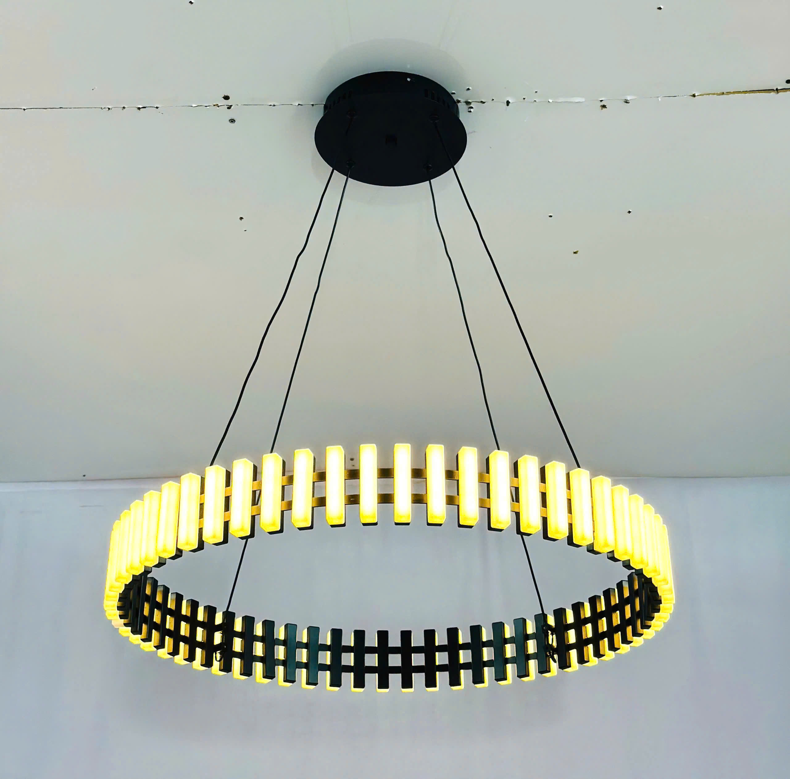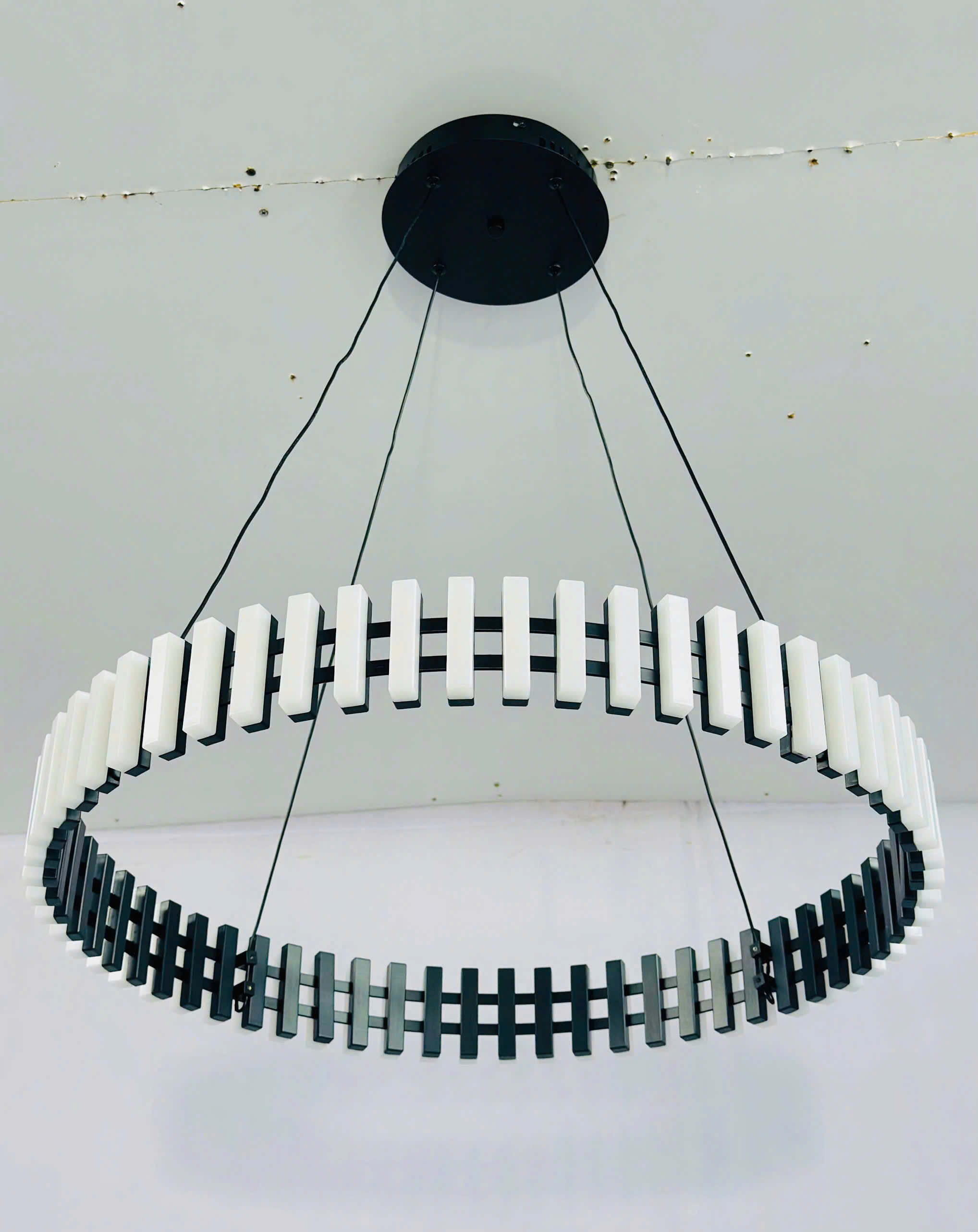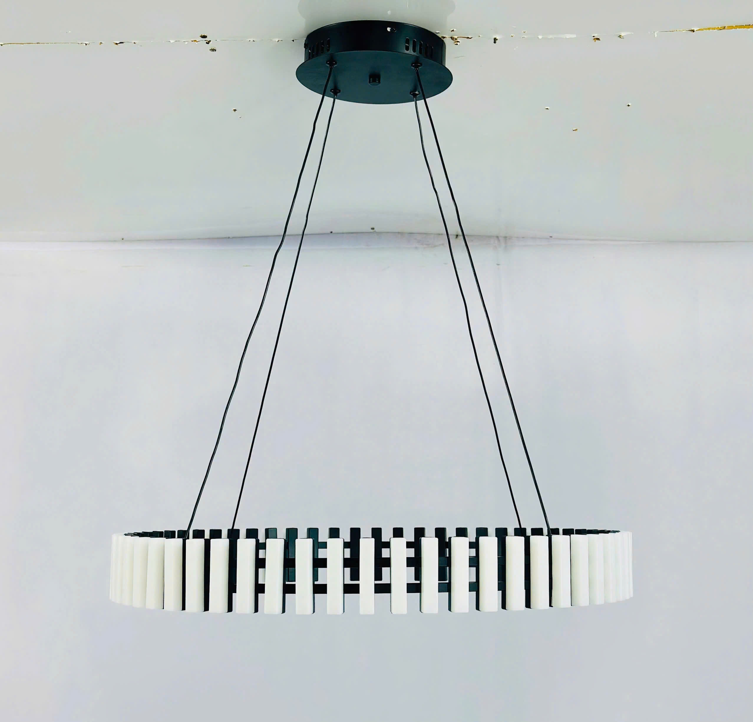 Mẫu đèn thả trần sở hữu kiểu dáng vòng tròn thanh mảnh, được tạo thành từ các thanh nhựa tản sáng và khung kim loại sơn tĩnh điện xen kẽ màu trắng và đen. Thiết kế đối xứng, cân đối giúp đèn phù hợp với nhiều phong cách nội thất như: