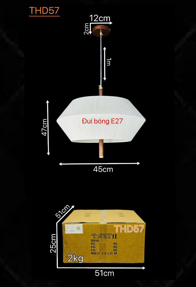 - Ánh sáng: THD57 sử dụng đui bóng E27 phổ biến, cho phép gia chủ linh hoạt lựa chọn các loại bóng LED với công suất và màu sắc khác nhau. Lớp chao vải giúp ánh sáng tỏa ra vô cùng êm dịu, không gây chói mắt, tạo cảm giác thư thái tối đa.