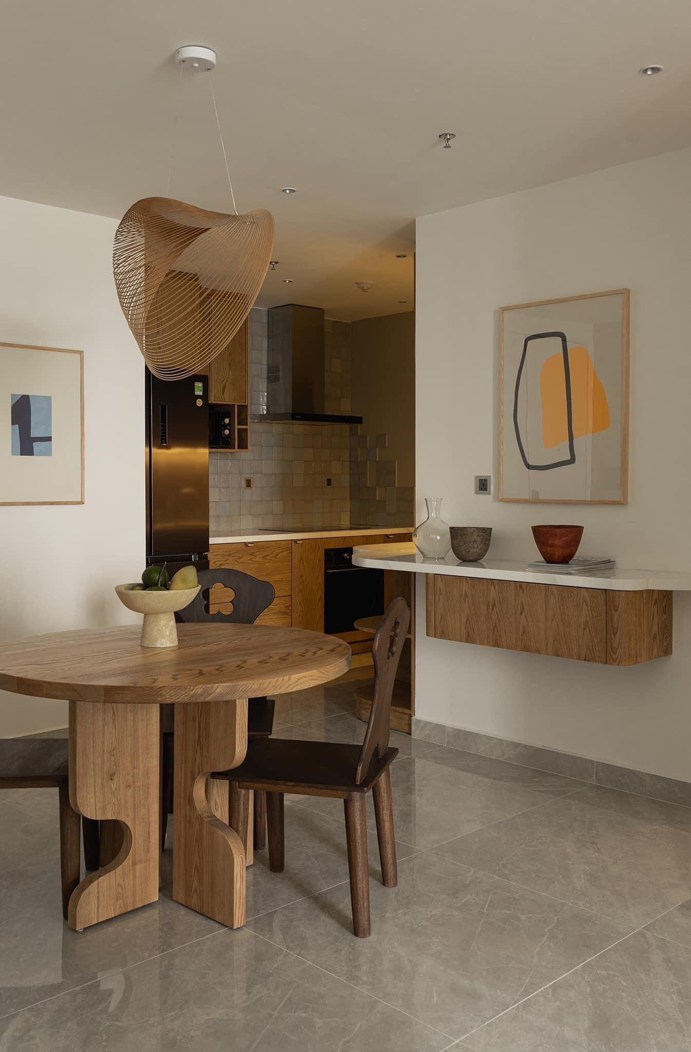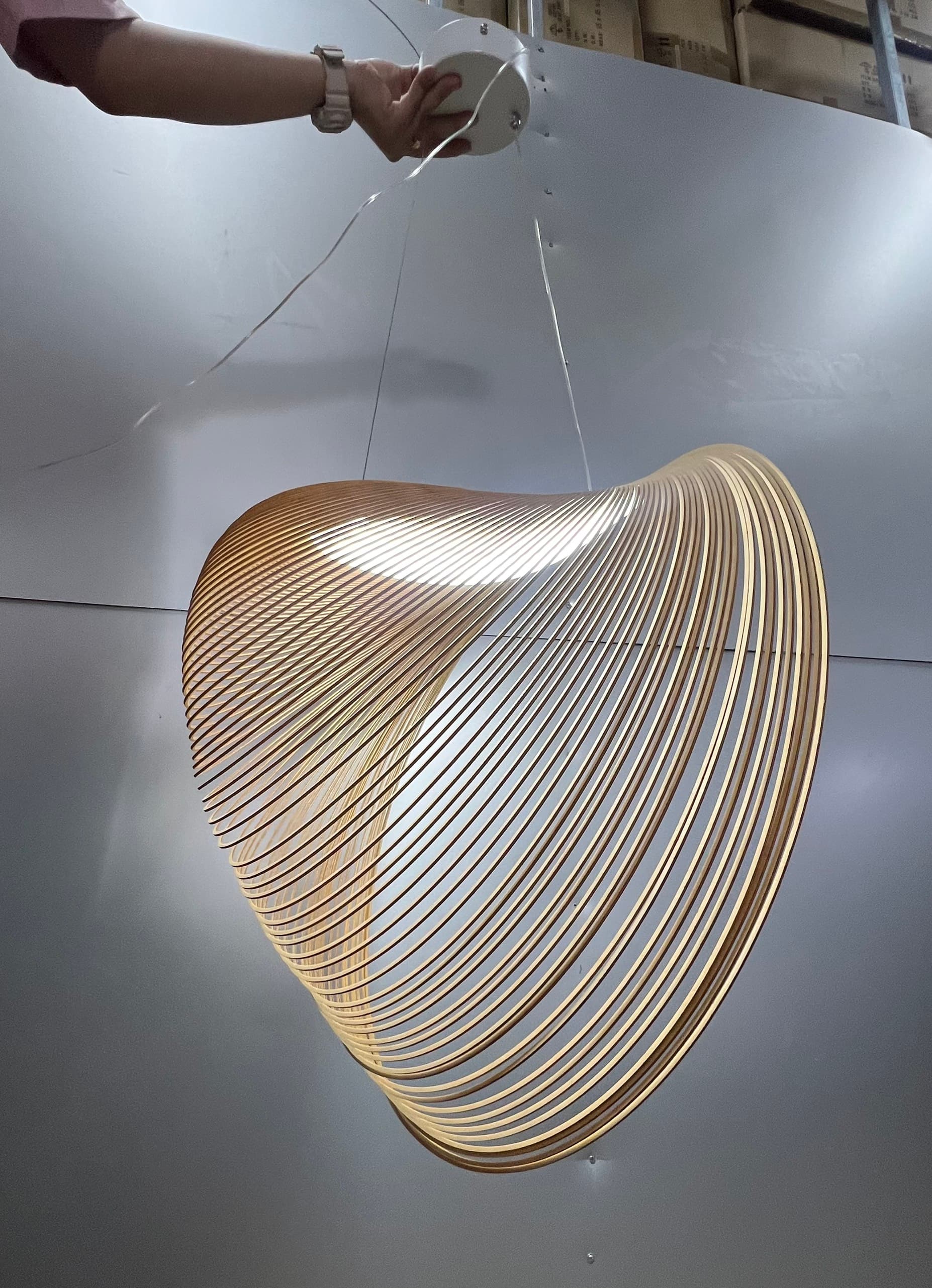 Thiết kế: Mang phong cách hiện đại, thiết kế vòng xoắn ốc độc đáo với chất liệu là các vòng gỗ mỏng nâng tầm nghệ thuật cho không gian sống