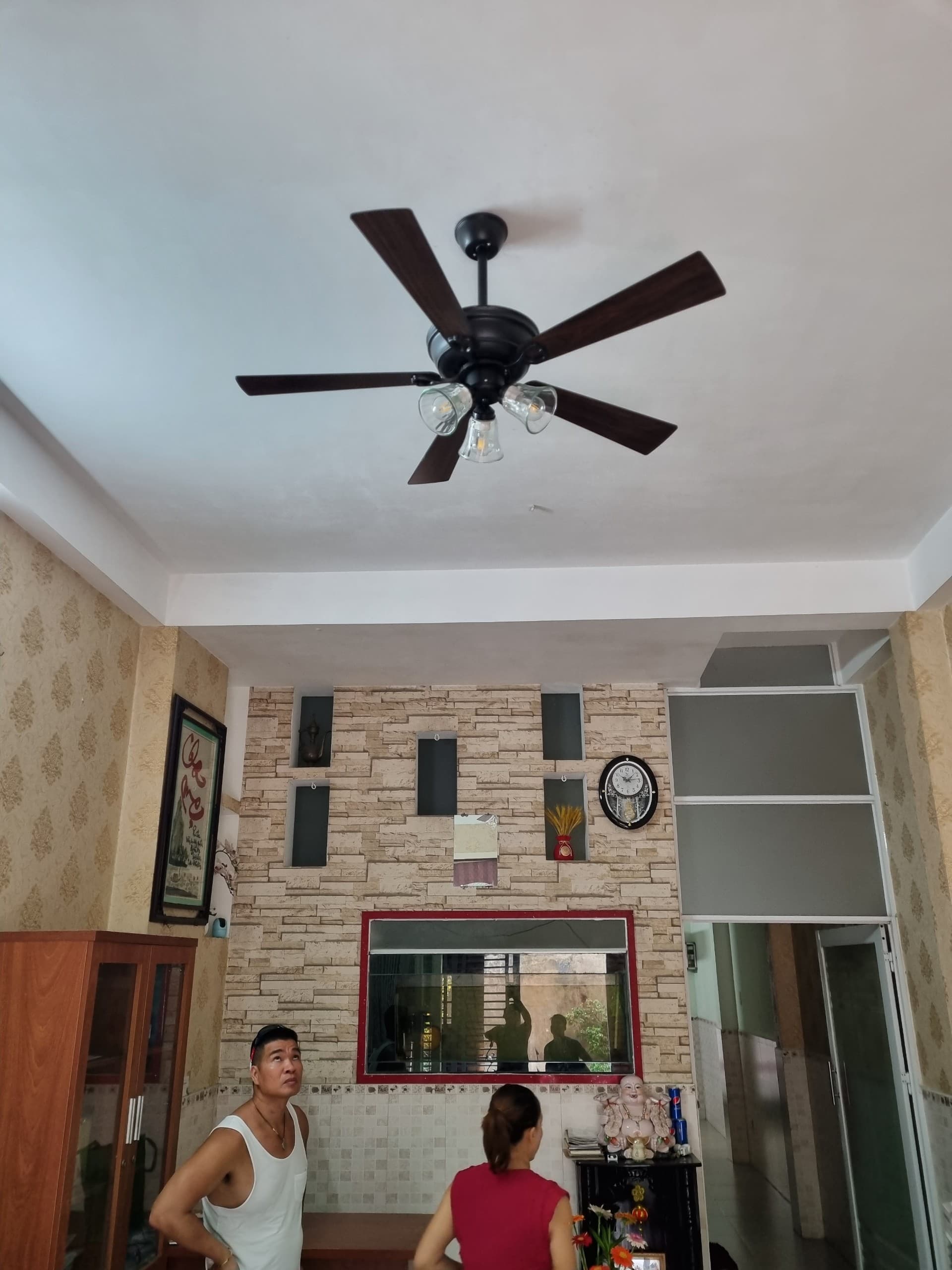 Hình ảnh thực tế quạt trần 355 có đèn 5 cánh gỗ nâu đỏ QT44