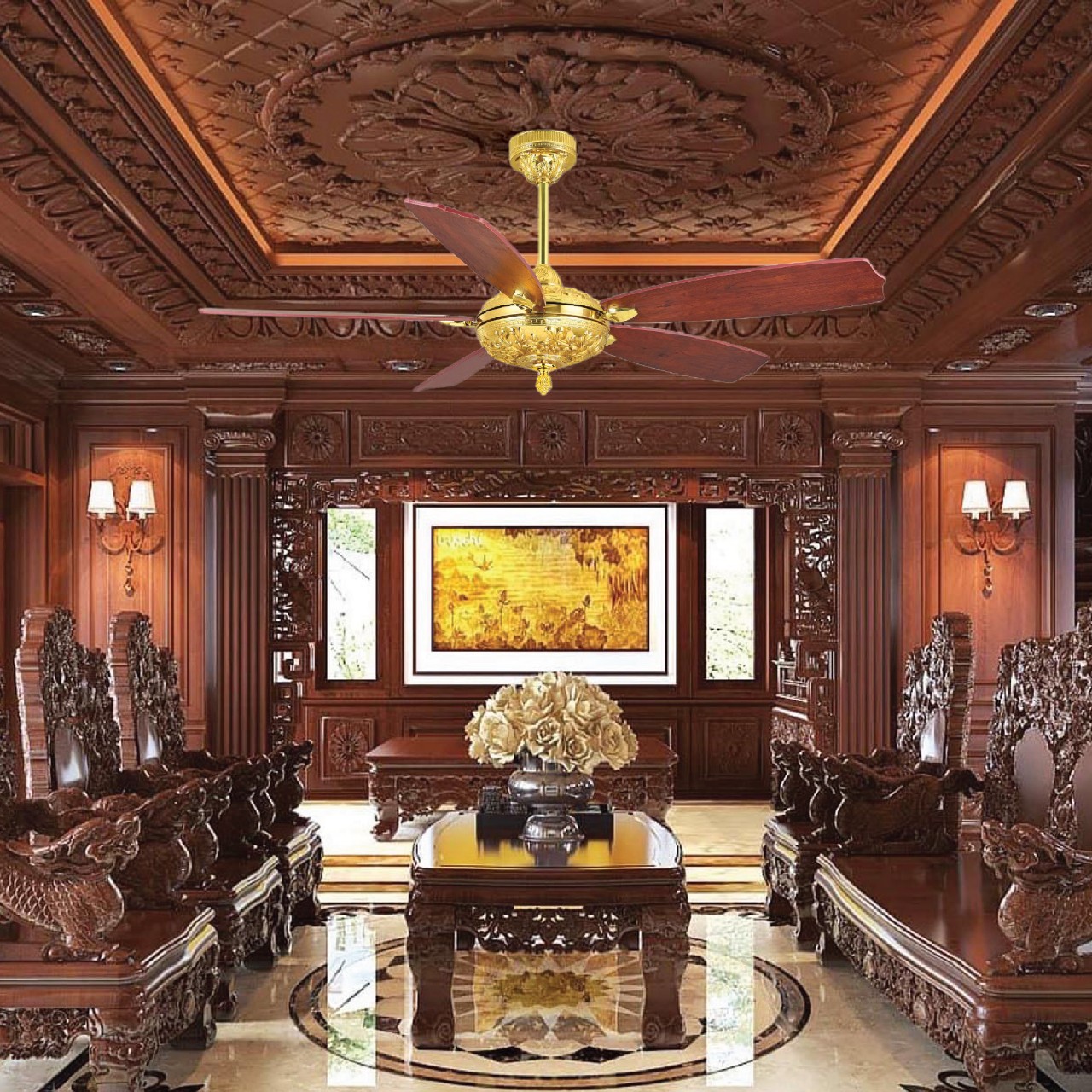 Phối cảnh quạt trần 5 cánh Fengye FY969 thân đồng mạ vàng ý 18K