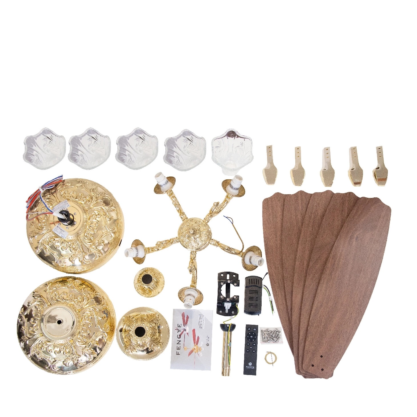 Quạt trần 5 cánh Fengye FY969 thân đồng mạ vàng ý 18K-Có đèn (FY966)