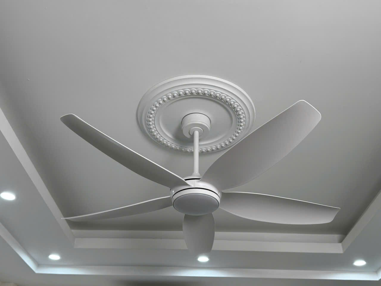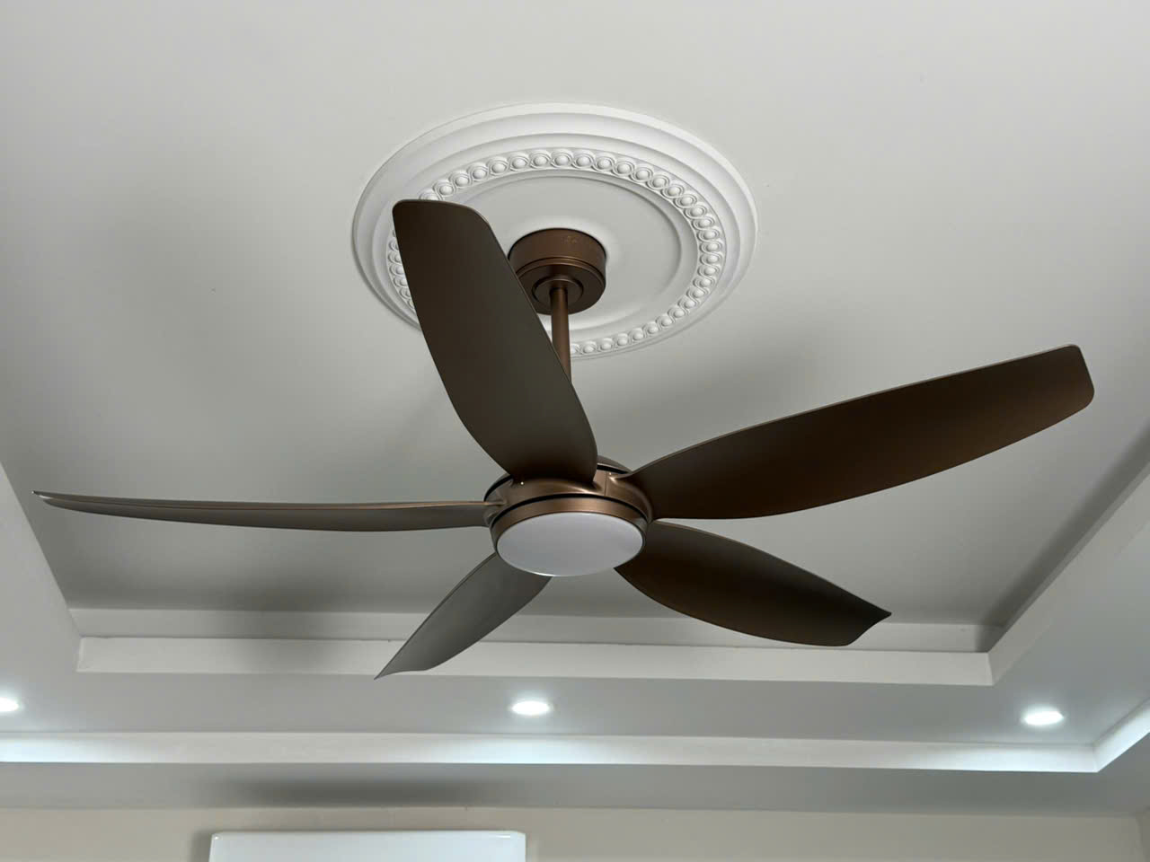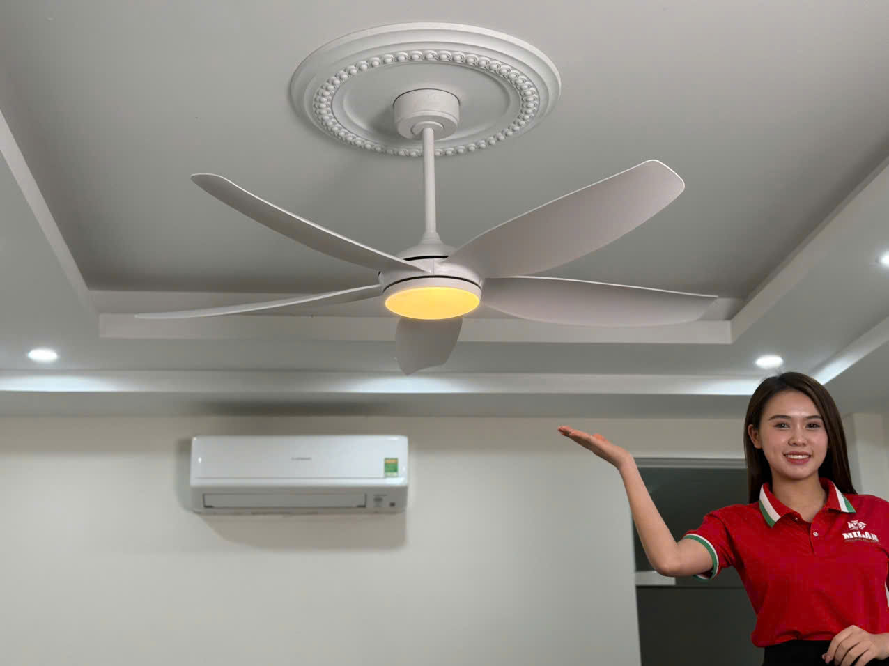 Hình ảnh lắp đặt thực tế quạt trần 5 cánh màu trắng có đèn Milan FY528
