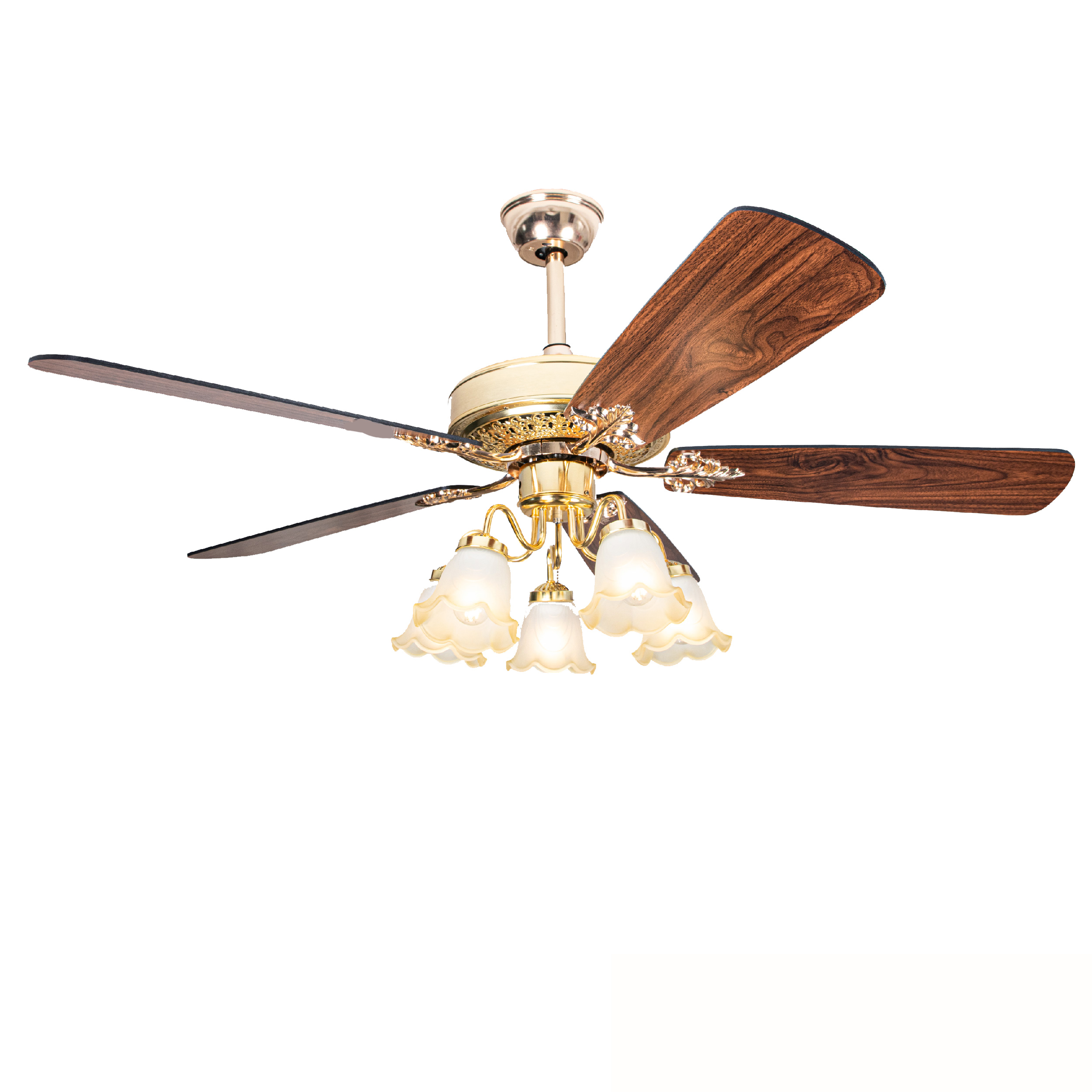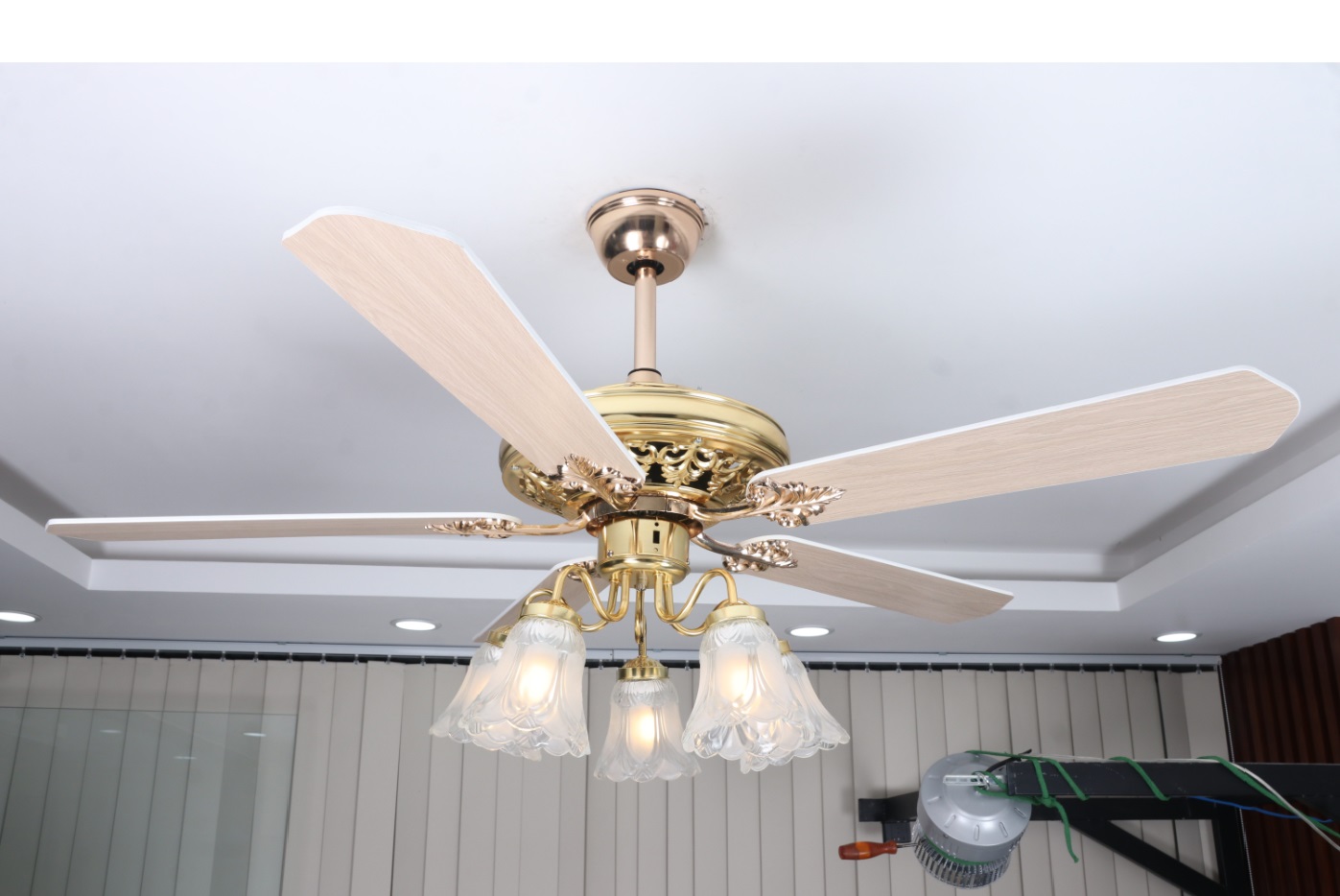 Quạt trần đèn 5 cánh màu gỗ nhạt phòng khách kiểu cổ điển |