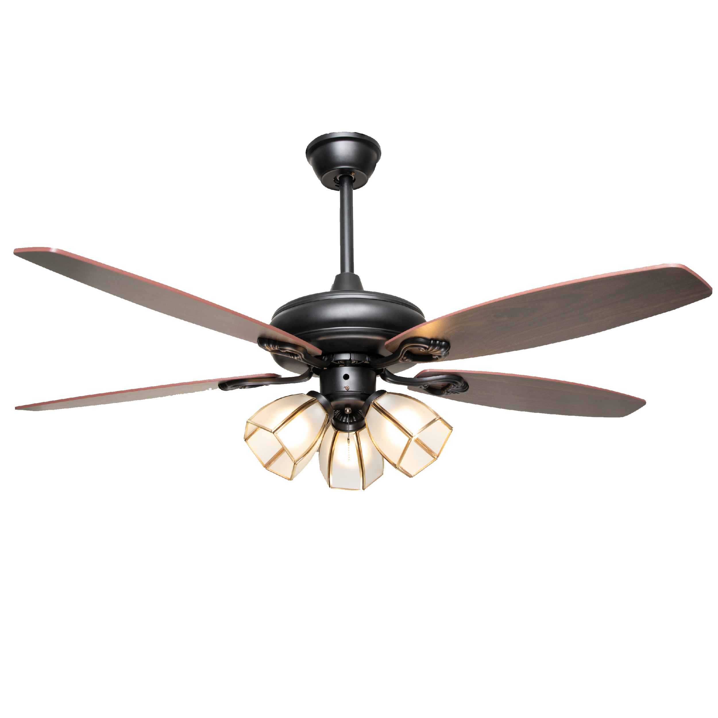 Mang phong cách cổ điển, thiết kế nhẹ nhàng tiết giảm các hoa văn chi tiết nặng nề, rườm rà, phần chao đèn được thiết kế chỉ màu đồng tinh tế. Tổng thể quạt mang nét sang trọng phù hợp cho cả không gian cổ điển và tân cổ điển