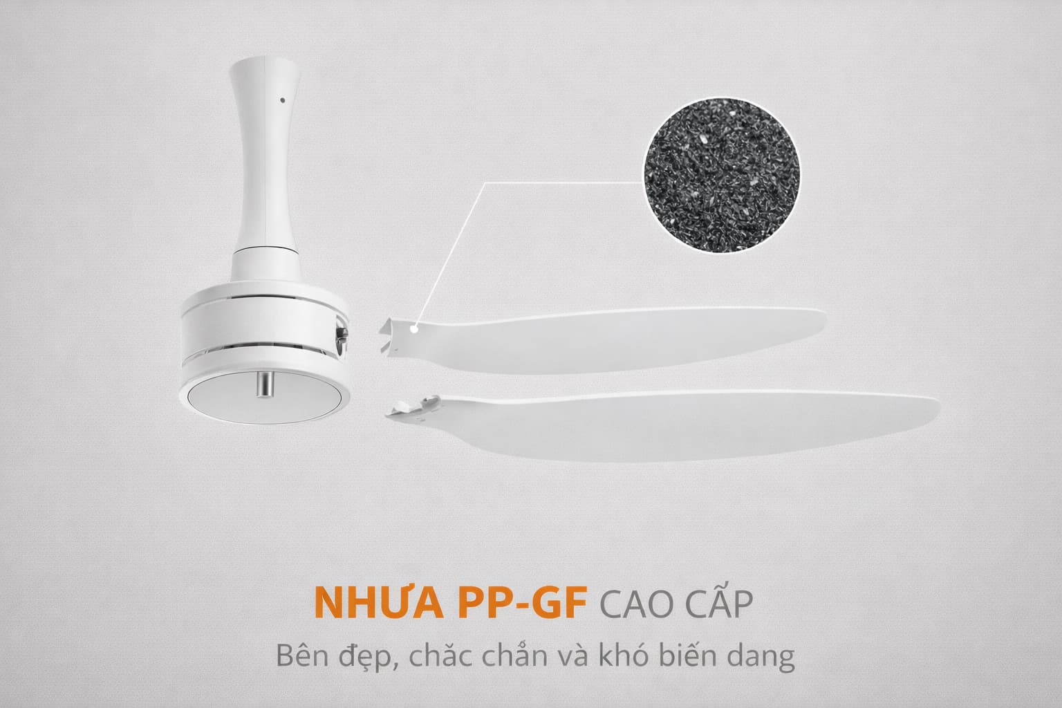 - Chất liệu nhựa PP-GF đột phá: Nanoco đã ứng dụng nhựa Polypropylene gia cường sợi thủy tinh (PP-GF) để chế tác cánh quạt. Đây là vật liệu thường thấy trong ngành công nghiệp ô tô nhờ đặc tính nhẹ nhưng có độ bền kéo cực cao, giúp cánh quạt giữ được biên dạng chuẩn xác, không bị biến dạng dưới áp lực gió ở tốc độ cao.