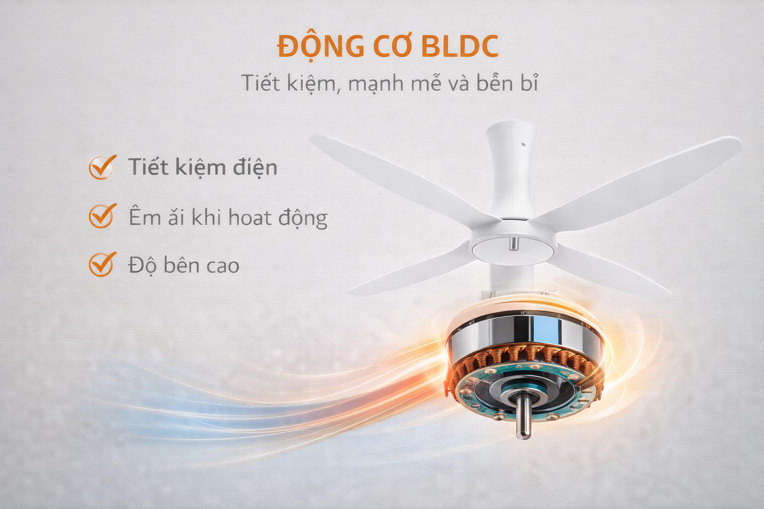 - Độ tĩnh lặng tuyệt đối: Nhờ cơ chế hoạt động bằng nam châm vĩnh cửu, quạt loại bỏ hoàn toàn tiếng "đánh lửa" và tiếng rè ma sát thường thấy ở động cơ AC truyền thống.