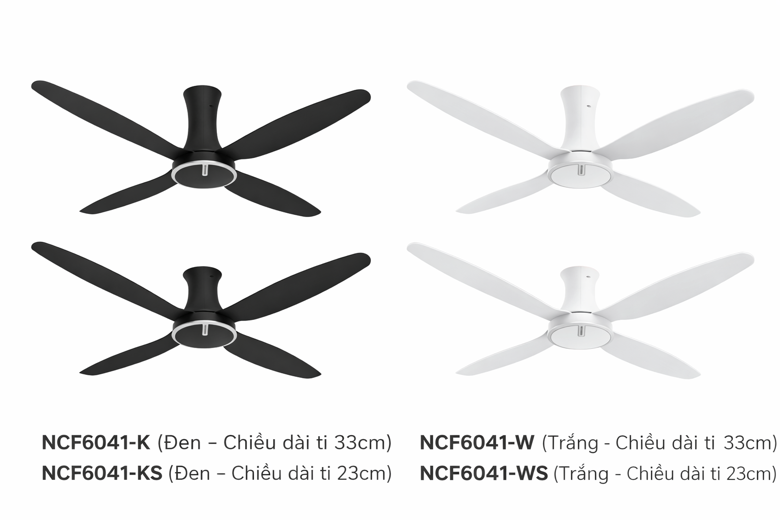 Quạt trần Nanoco 4 cánh NCF6041 có 2 lựa chọn màu, và 2 chiều dài ti
