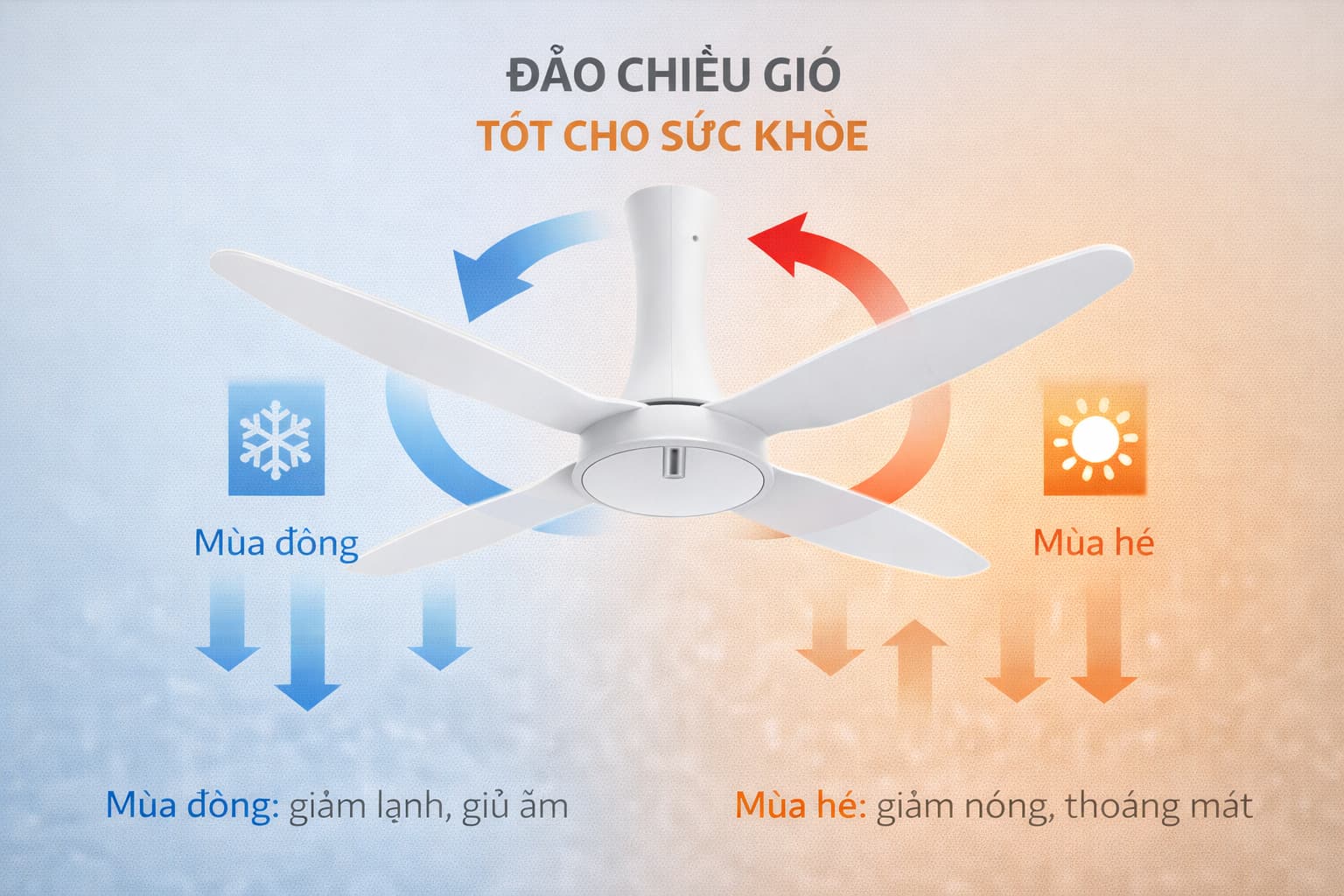 - Hỗ trợ máy lạnh chuyên sâu: Khi quay ngược chiều, quạt không thổi gió trực tiếp mà tạo lực hút để luân chuyển khối không khí lạnh từ sàn lên trần và tỏa đều ra xung quanh. Điều này giúp nhiệt độ trong phòng ổn định nhanh chóng, ngăn chặn hiện tượng "sốc nhiệt" và khô da khi dùng điều hòa lâu.