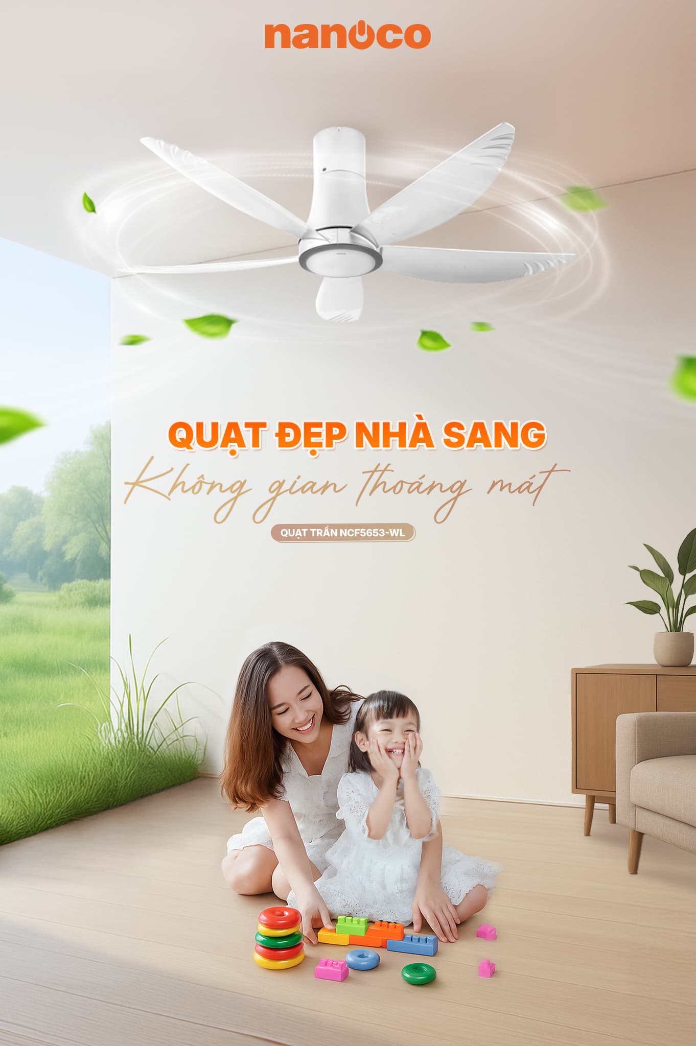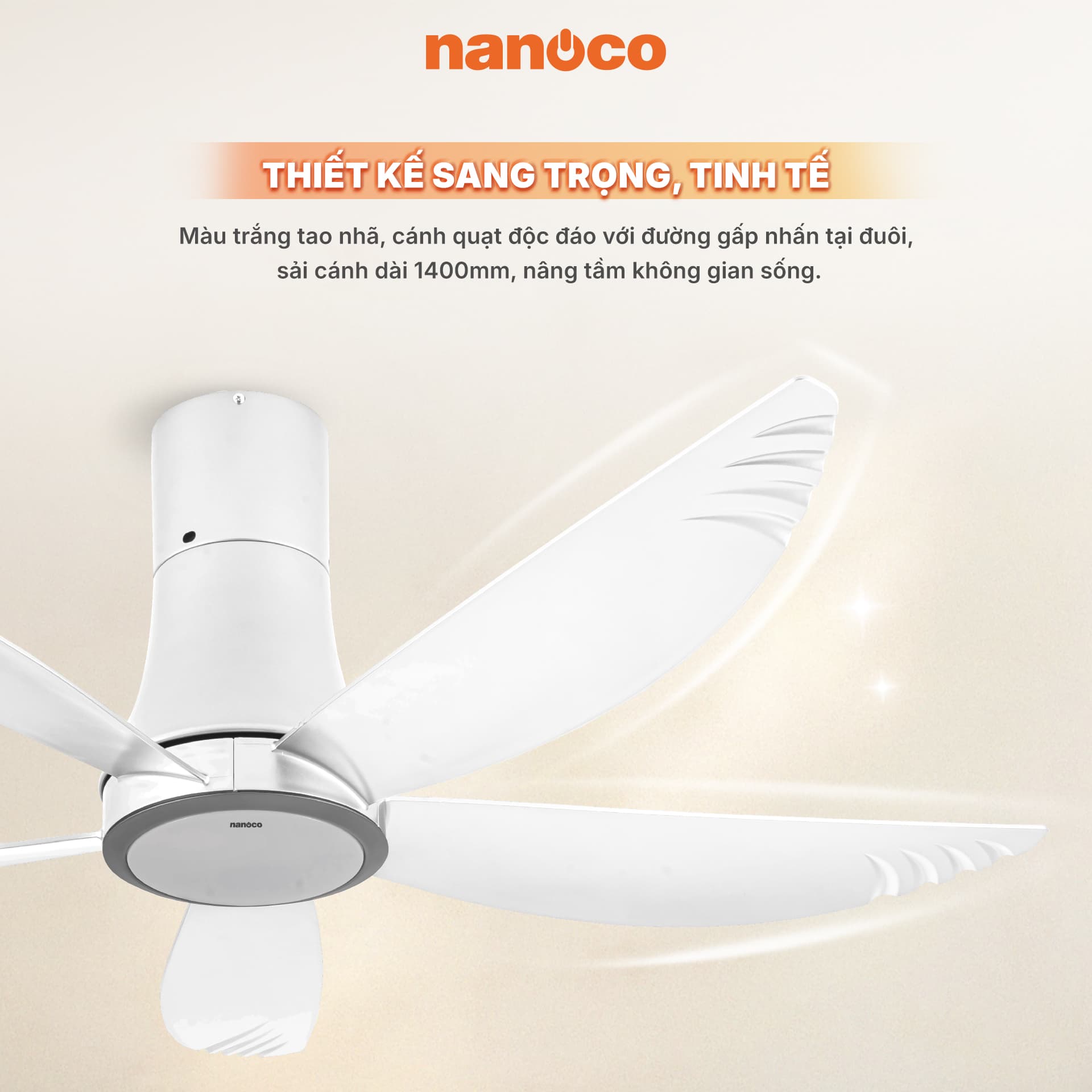 Với sải cánh 140cm và thiết kế ty treo ngắn gọn gàng, Nanoco NCF5653-WL đặc biệt phù hợp cho: