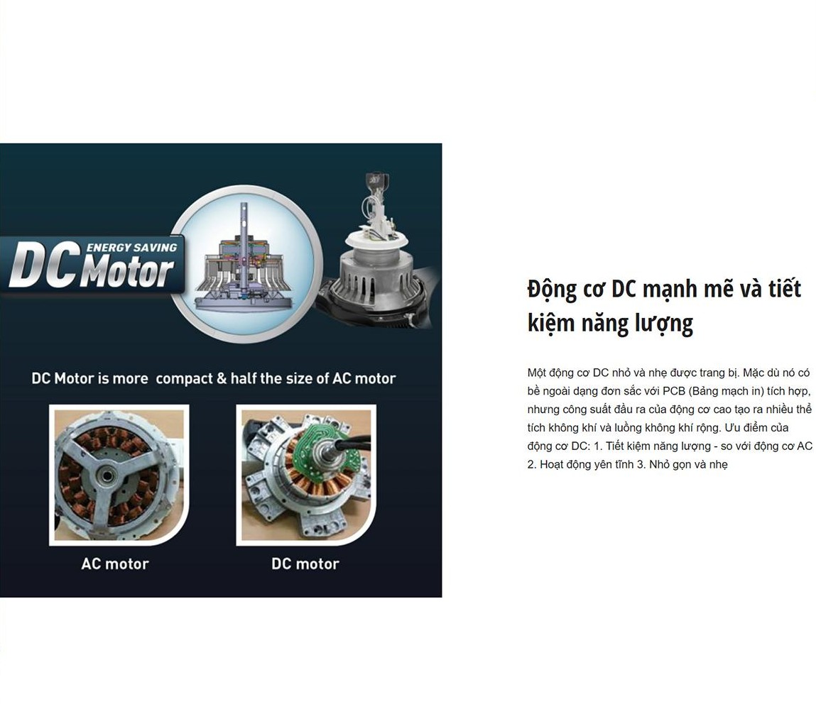 Quạt sử dụng động cơ DC thế hệ mới nhất của Panasonic công suất tối đa chỉ 40W sinh nhiệt rất thấp khi sử dụng trong một thời gian dài, giảm tới 64% chi phí điện hàng tháng so với các dòng quạt công suất 60-80W thông thường