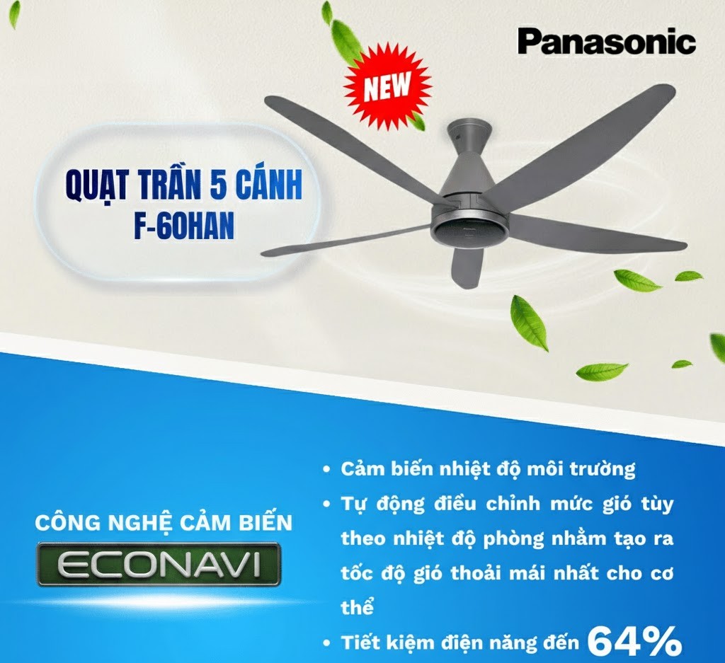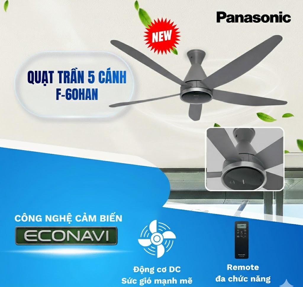 Quạt trần Panasonic 5 cánh màu xám F-60HAN được ra mắt ở cuối năm 2025, quạt không chỉ là một thiết bị làm mát, mà còn là một tác phẩm nội thất hoàn hảo dành cho những không gian hiện đại và đề cao sự tối giản, hiệu quả. Đây là mẫu quạt trần 5 cánh cao cấp, được tích hợp những công nghệ tiên tiến nhất của Panasonic: Động cơ DC Inverter và Cảm biến thông minh Econavi.