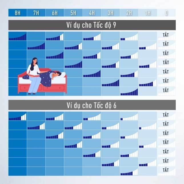 - Chế độ gió theo nhịp sinh học lúc ngủ (Sleep mode) có thể tùy chỉnh linh hoạt